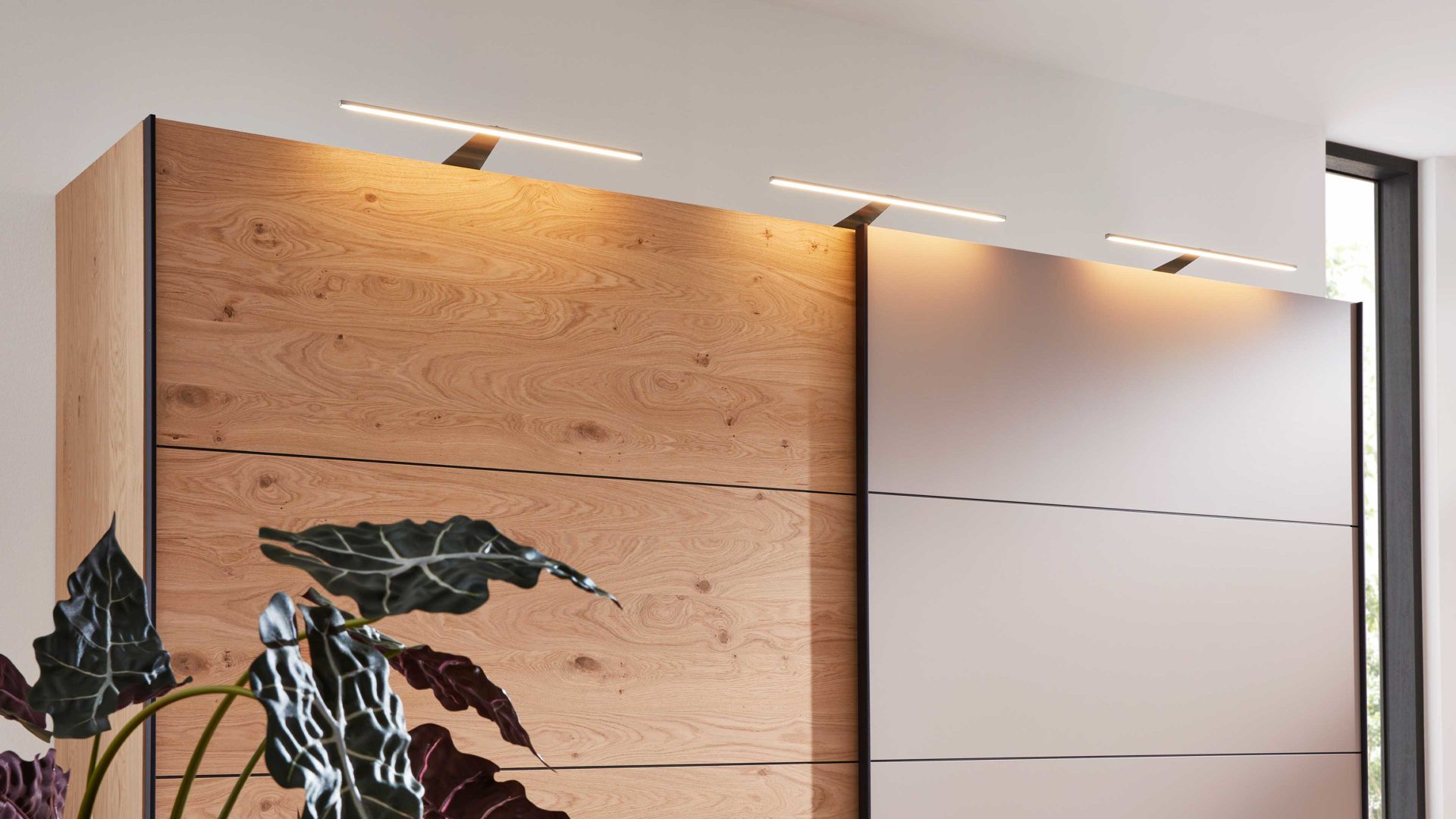 Die Aufsatzstrahler 90053 aus der Interliving Schlafzimmer Serie 1024 dienen als akzentuierende Kleiderschrankbeleuchtung und