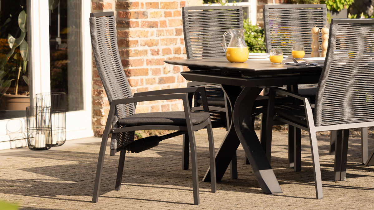 Die stufenlos verstellbare Rückenlehne mit robuster Rope-Bespannung macht diesen Terrassen-Positionsstuhl besonders vielseitig. Ob zum Lesen, Relaxen oder Sonnen – du passt ihn mit wenigen Handgriffen an deine Sitzposition an. Die luftdurchlässige TEXTILENE®-Sitzfläche ist reißfest, lichtecht, schnelltrocknend, UV-beständig und resistent gegen Mikroorganismen – ein idealer Begleiter für den ganzjährigen Einsatz im Freien.