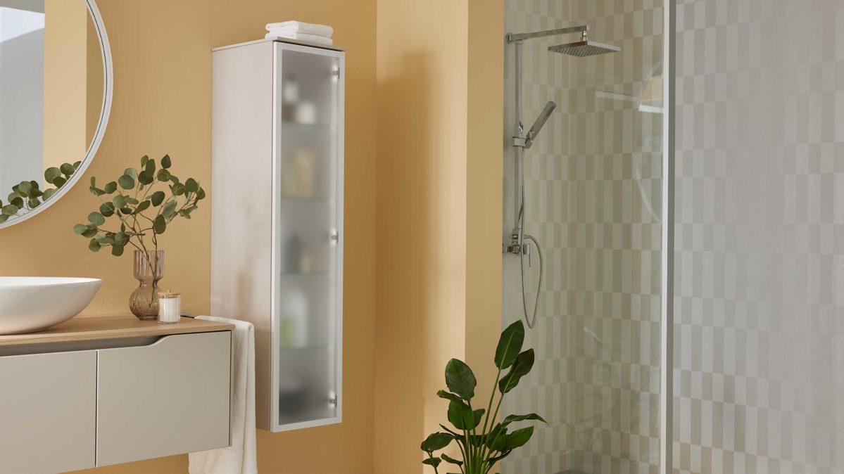 • Die Abbildung zeigt ein Wohnbeispiel, welches auch Dekoration sowie separat erhältliches Zubehör enthält. Im Lieferumfang enthalten sind ein Waschbecken, ein Ablageboden und drei Unterschränke.