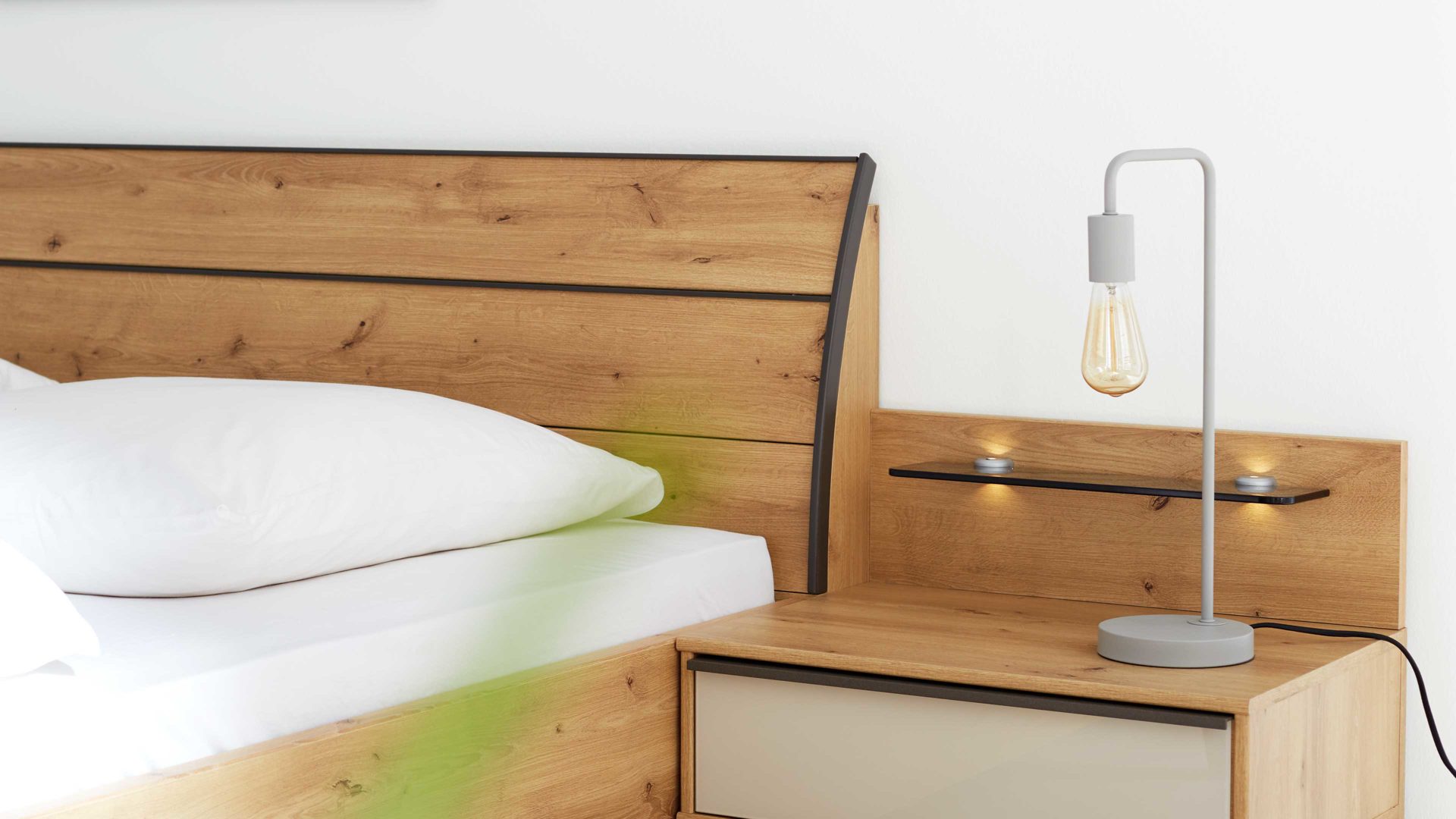 Natürlich & modern zugleich: Die Kombination aus Bianco Eiche Nachbildung und einer edlen Rauchglasablage sorgt für warme, zeitgemäße Leichtigkeit. Das Paneel harmoniert perfekt mit weiteren Möbeln der Serie 1205 und fügt sich nahtlos in unterschiedliche Schlafzimmerstile ein.
