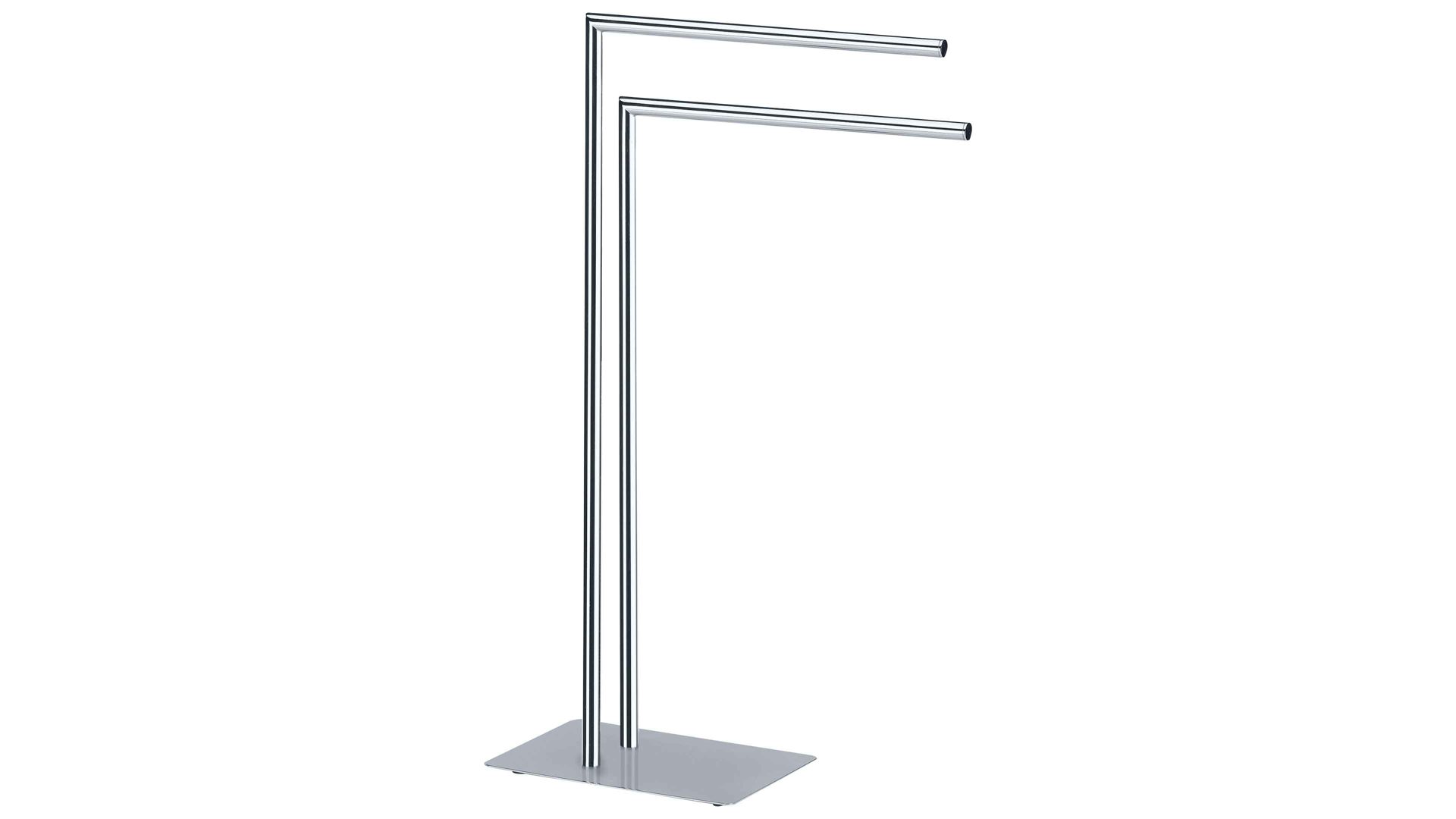 Sie haben die Wahl: Entweder Sie hängen zwei große oder mehrere kleine Handtücher auf die zwei feststehenden Stangen des Standmodells. Der Halter für Ihre Tücher steht auf einer Bodenplatte und hat die Maße von ca. 20 x 81 x 30 cm (BxHxL), womit das Modell sowohl in ein großes als auch ein kleineres Badezimmer passt.